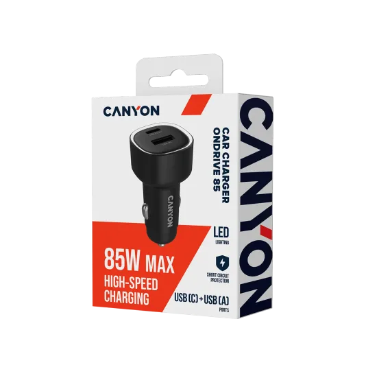 Stay fully powered anywhere you go with the OnDrive 85, a car charger designed to deliver professional-grade performance in a compact form. Equipped with a high-output USB(C) port supporting up to 65W Power Delivery, it can charge modern laptops, tablets, and smartphones at maximum speed. Alongside it, a QC18W USB(A) port provides fast, dependable charging for legacy devices, ensuring full compatibility with all your tech. With a combined total output of 83W, this charger erases the need to compromise when powering multiple devices at once. Built-in protocols such as PD3.0, QC3.0, FCP, and AFC guarantee broad support across brands, adapting automatically to your device’s requirements for safe, efficient energy transfer. Durability and safety are at the core of its design. The OnDrive 85 features short-circuit protection to safeguard both your car and devices, and its precision-engineered PC shell ensures a solid build that withstands daily use. A subtle blue LED indicator provides clear visibility without distracting from your drive. When you’re commuting, traveling for business, or heading out on a family trip, the OnDrive 85 will provide a charging solution powerful enough for laptops yet versatile enough for everyday devices.