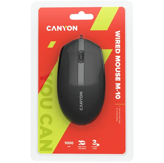 Canyon's premium wired M-10 mouse is designed to work optimally with any computer or laptop. Its main feature is a low-friction base coating that allows the mouse to glide smoothly on any table, rug or other working surface. The precise optical sensor and robust construction ensure comfortable and stable work, while the symmetrical design and low weight make it easy to operate in either hand for a long time. The perfect companion for daily use.