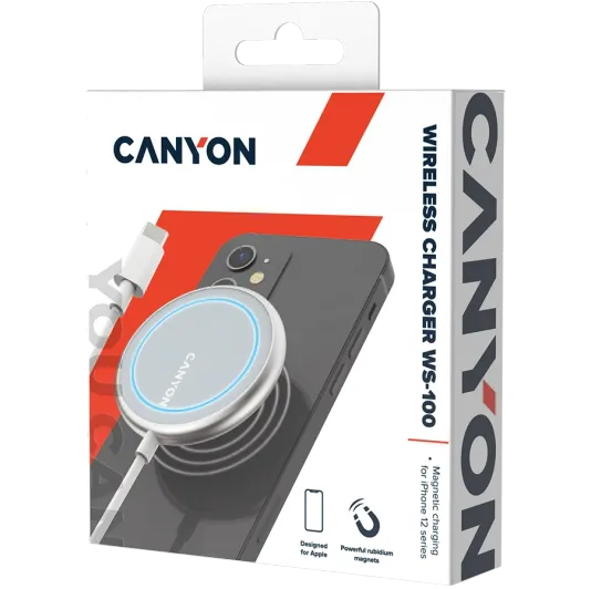 This wireless charger by Canyon was made specifically for Apple iPhone users. It takes up minimal space and ensures easy charging. Built-in rubidium magnets ensure firm fixation and magnet charging of iPhone 12 and newer with optimized speed. You can easily charge other Qi-compatible mobile devices as well. For the best charging performance, we recommend using the PD18W power adapter. Slim body, high-quality materials and neutral, pleasant texture will delight fans of stylish gadgets. Perfect design for those who enjoy using gadgets by Apple!